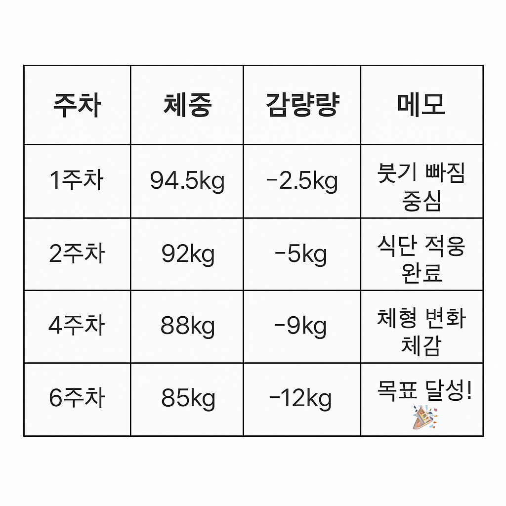 위 표는 제가 실제로 6주 동안 기록한 감량 결과예요. 처음엔 붓기가 빠지면서 시작했고, 식단에 적응한 이후 점점 감량 속도가 안정화되었어요.